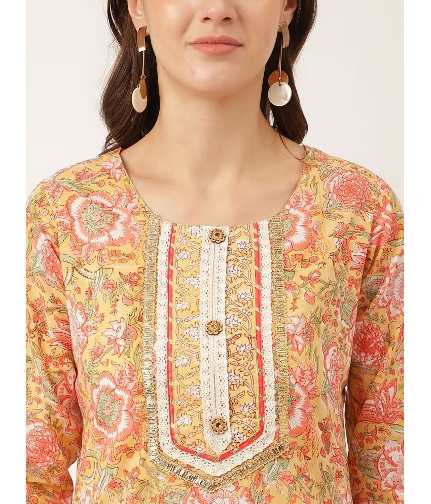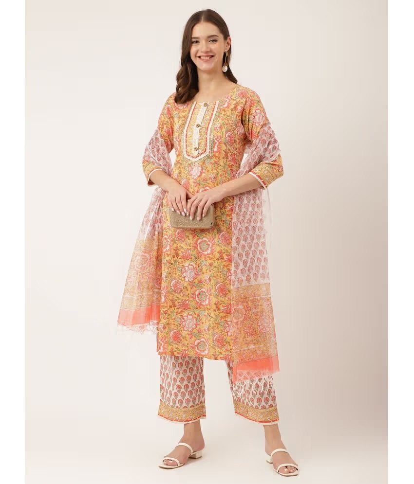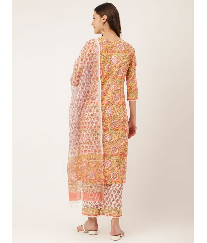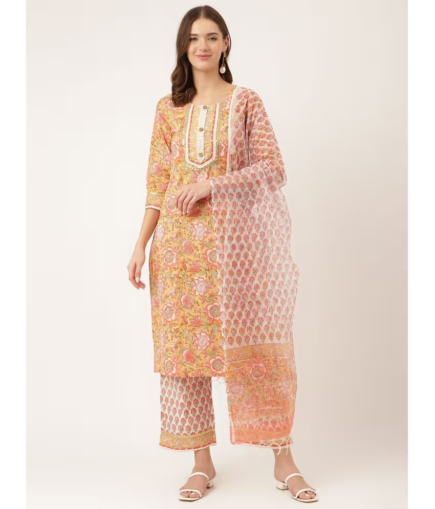 & Free ShippingYellow Hand Block Floral Print Cotton Kurta, Trouser With Dupatta